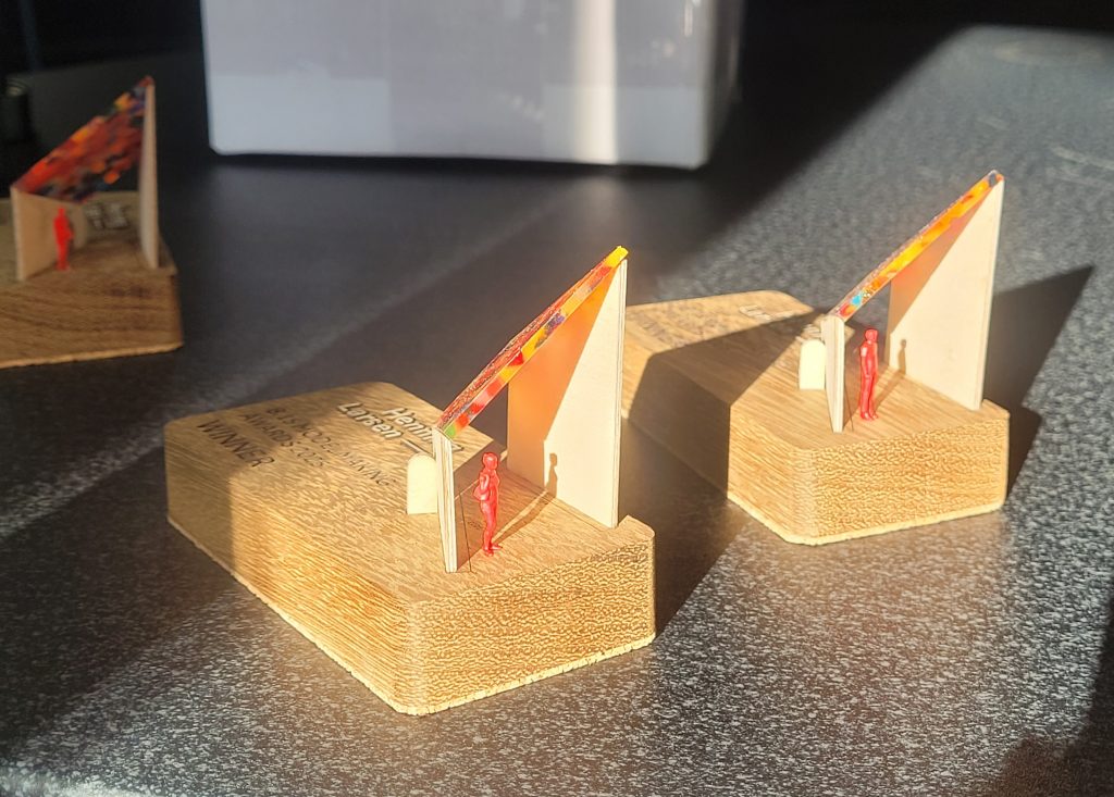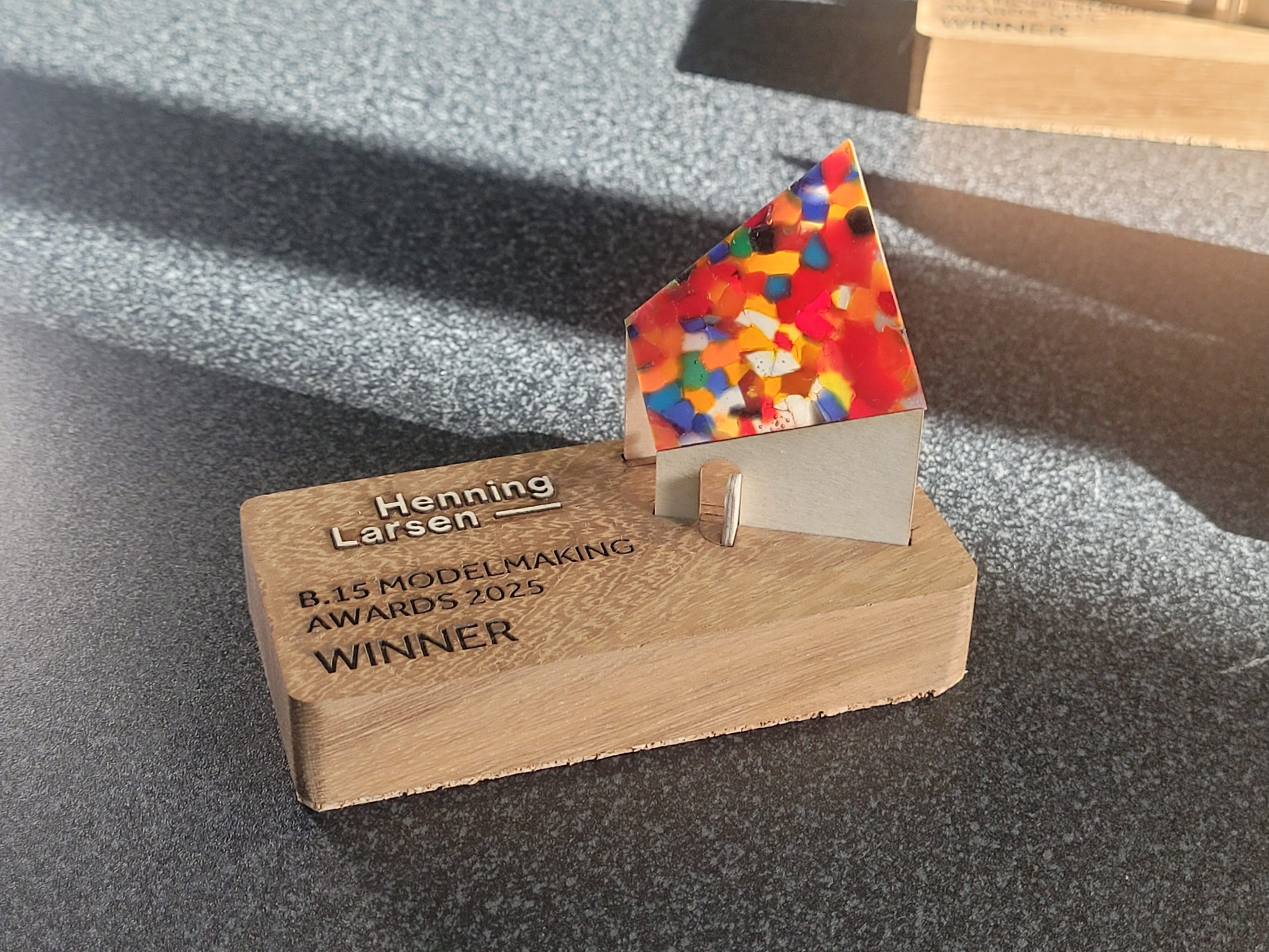 We’re now thrilled to say that we’ve received our first batch of recycled sheet material made entirely from the waste we had been storing over the years. Some of this recycled material has already been put to use, forming part of our B.15 Modelmaking award trophies that were handed out to this years student winners at the Manchester School of Architecture 2025 Degree Show.